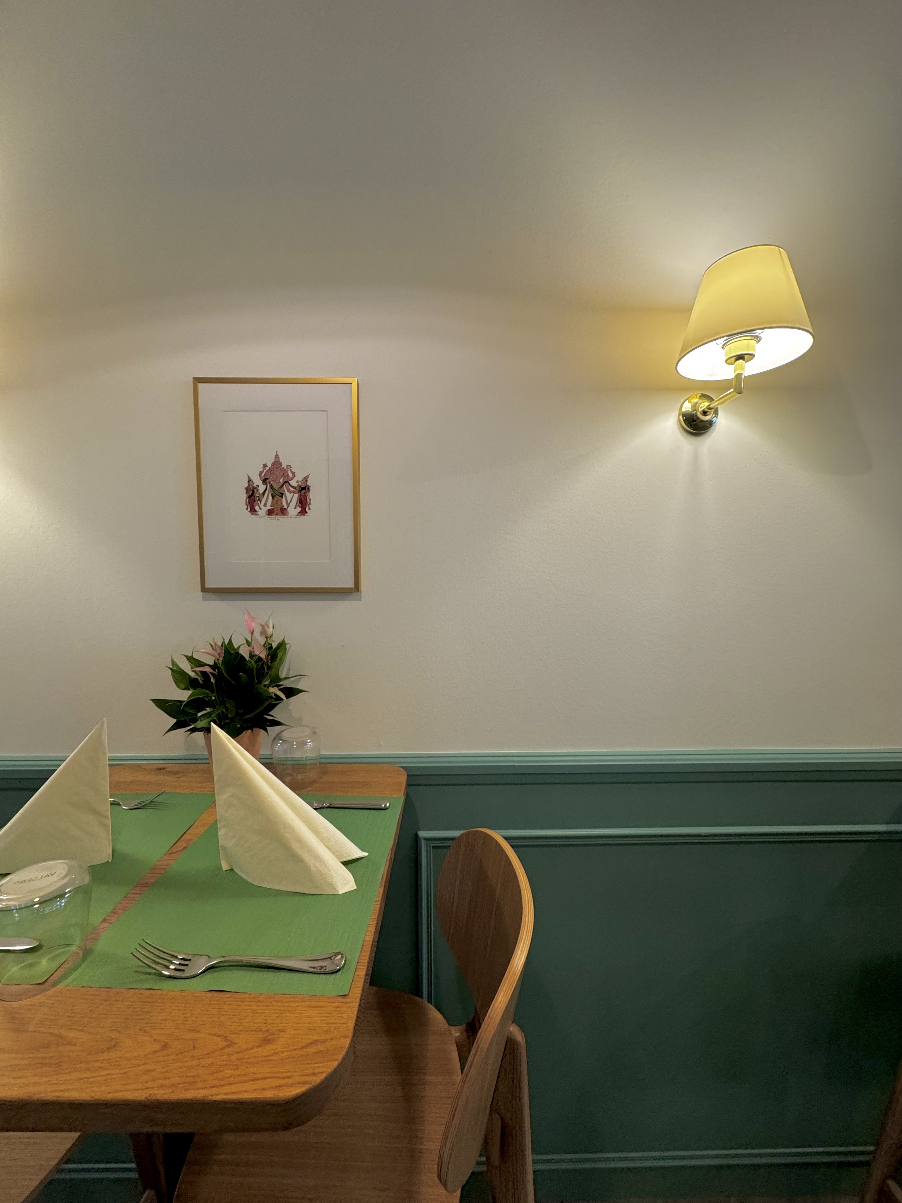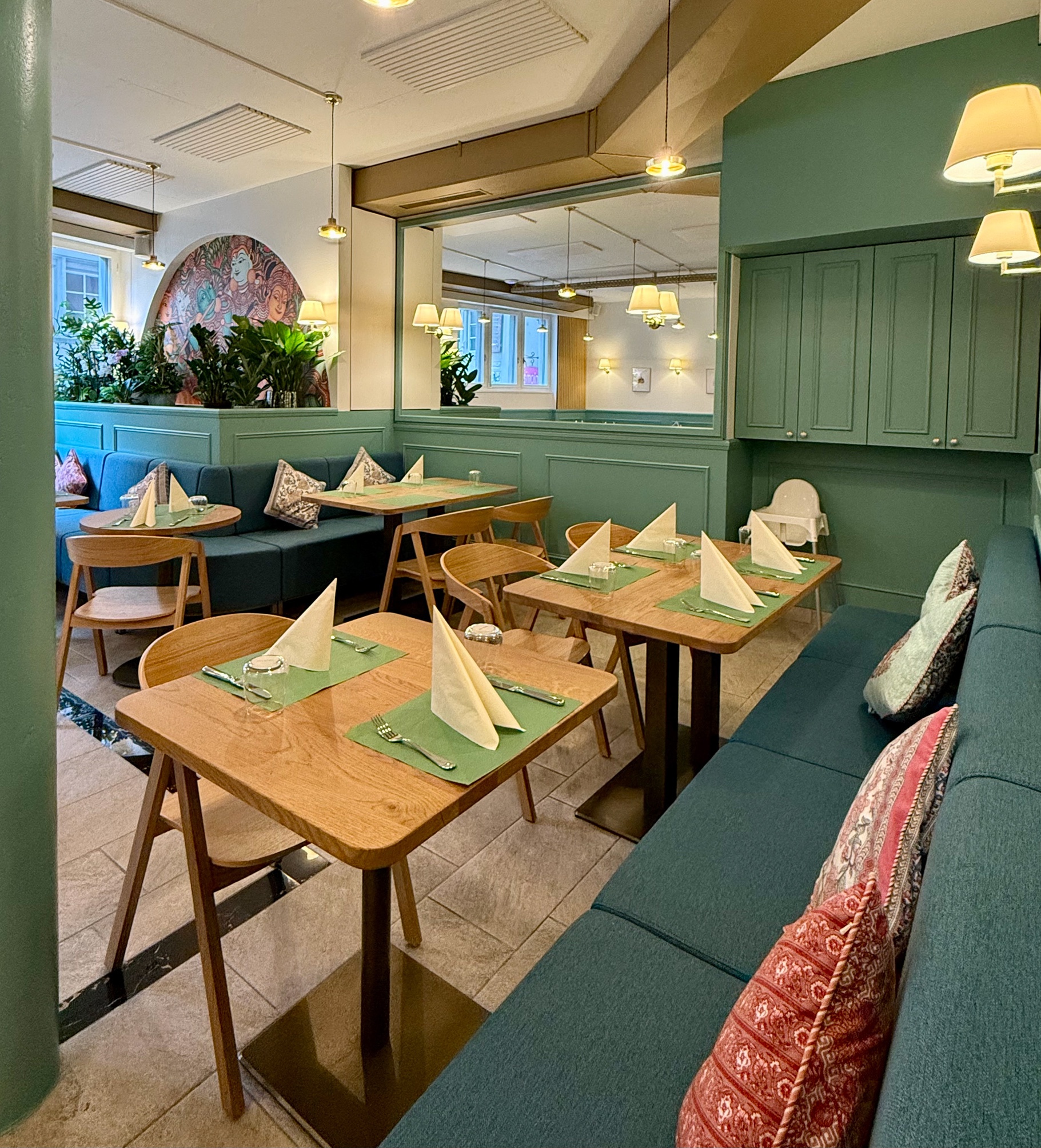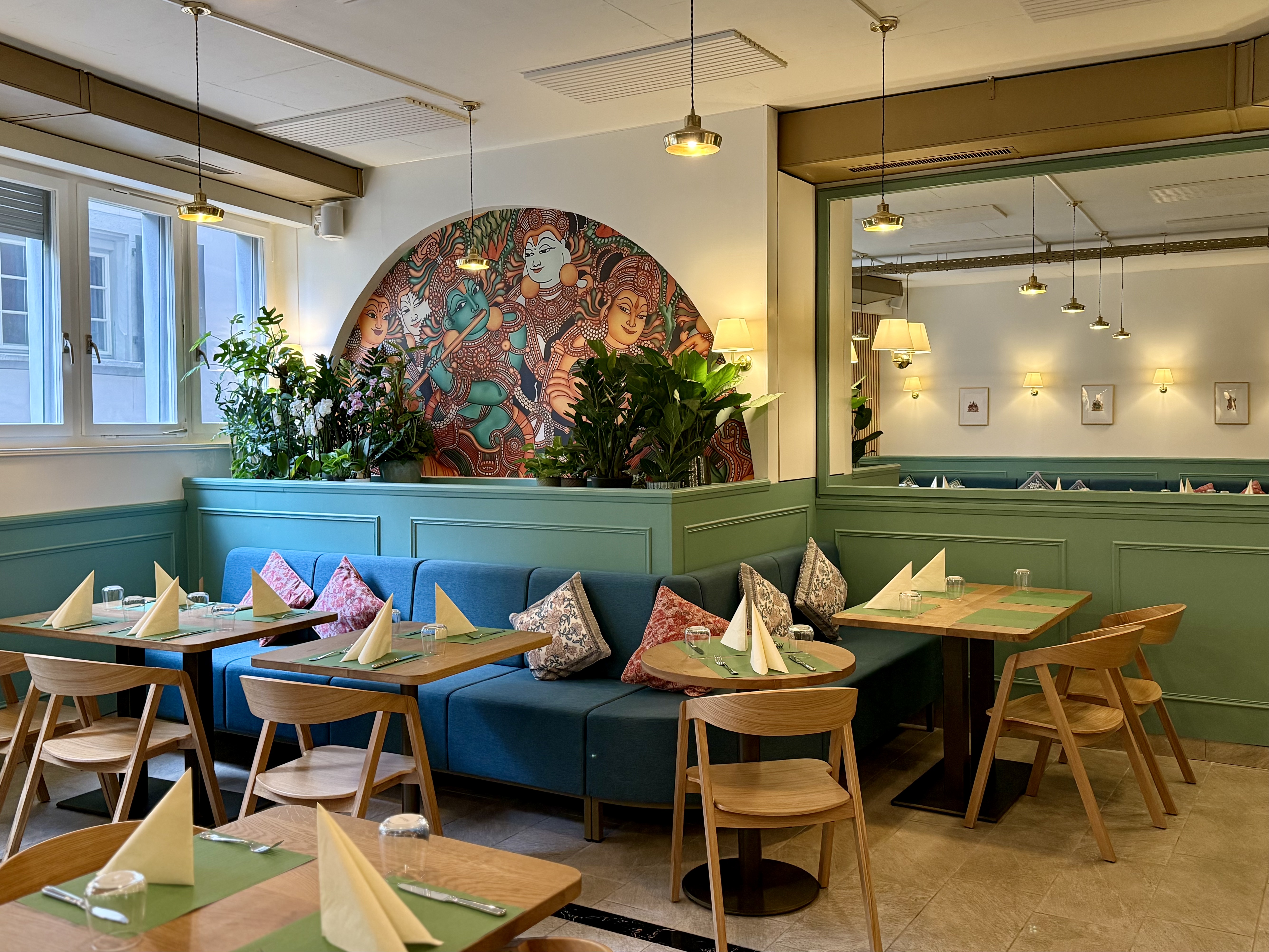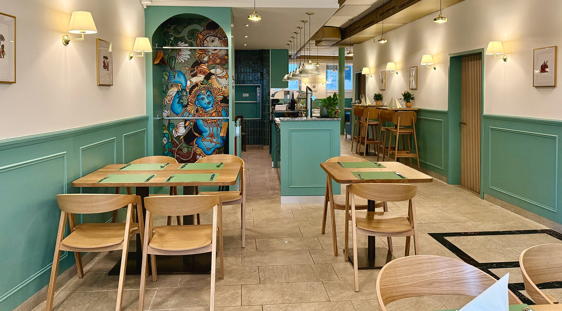 Meanwhile, the Kerala murals, known for their delicate line work and earthy tones, grace the accent walls, narrating ancient stories with a serene elegance. Together, these art forms transform the space into a living gallery, where every meal becomes a cultural immersion.
